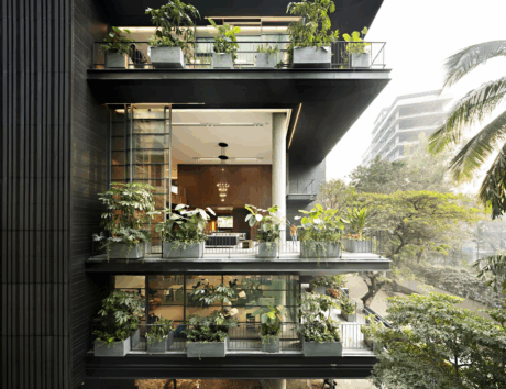 Balcony design blends privacy and openness, creating a tranquil green retreat amidst vibrant urban surroundings.
