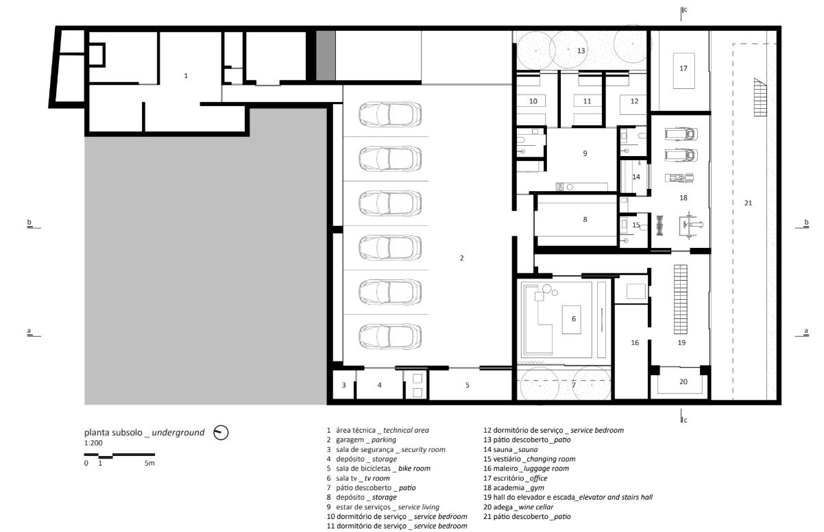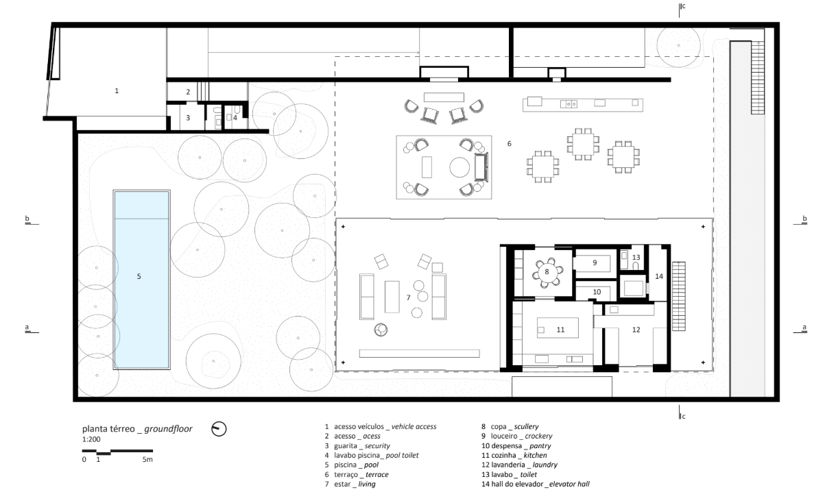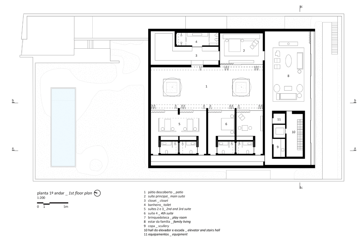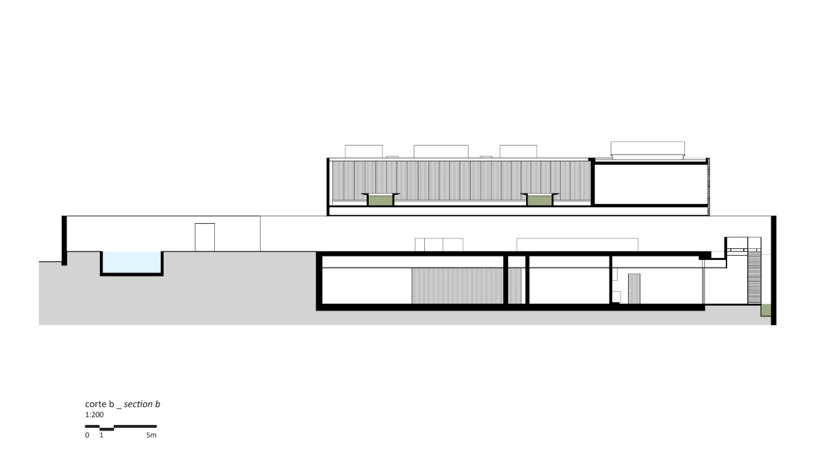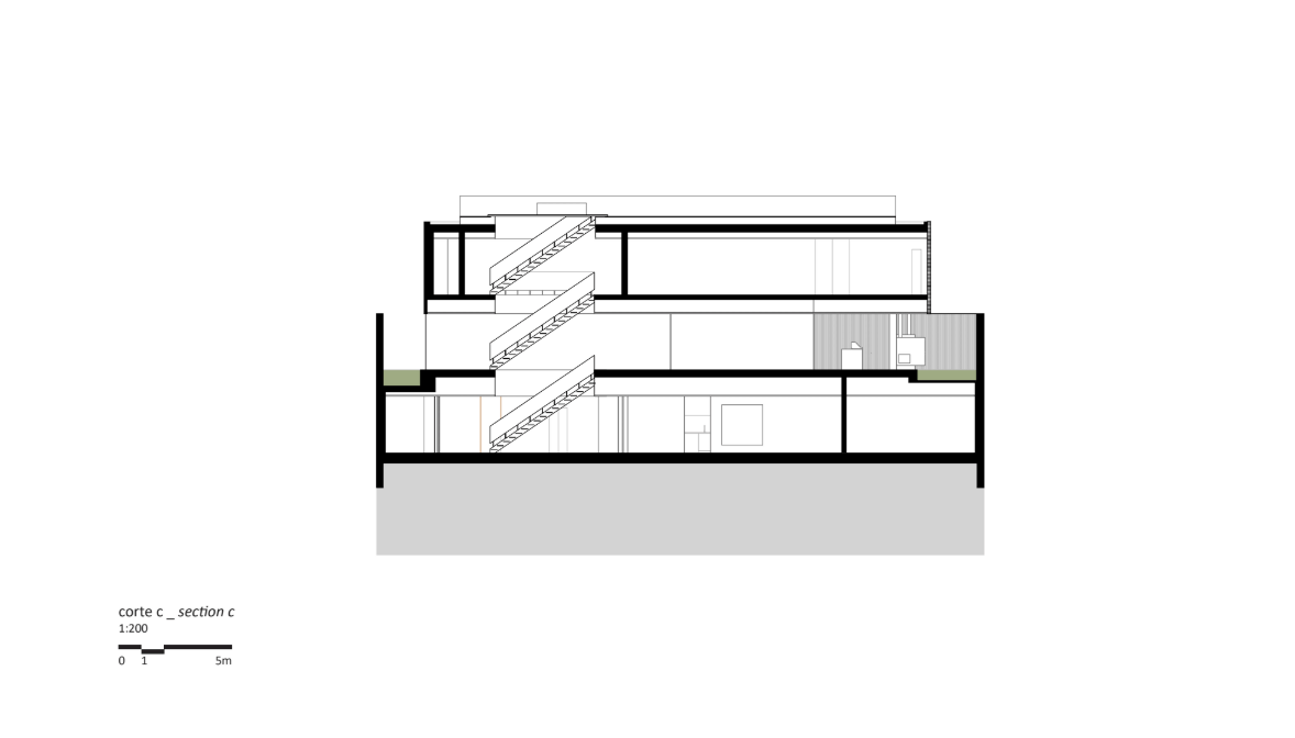 One of the key challenges was ensuring comfort in a noisy urban environment. The site is located near a busy avenue, making acoustic isolation a fundamental concern. “The main challenge was to shield the house from urban noise, especially from a high-traffic avenue nearby,” the architects reveal. “The solution was to set the house back from the plot’s edges and create a dense vegetation barrier, towards which the common areas on the ground floor open.” Meanwhile, the upper concrete volume adds another layer of acoustic insulation, with the private rooms turned inward. “The intimate spaces face an internal, tree-lined courtyard, creating a quiet and secluded retreat within the house.”