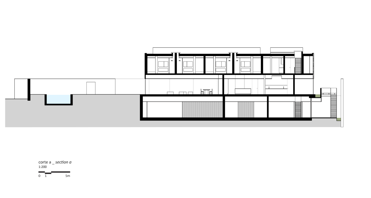 The house's architectural composition is defined by an exposed concrete upper volume that appears to float above the transparent, glass-enclosed ground floor. This contrast enhances both privacy and openness. “The exposed concrete in the upper volume brings privacy to the intimate areas, while the glazed ground floor creates lightness and fosters a strong connection with the garden,” they describe. The hybrid structure, combining steel and concrete, enables large spans without visual obstructions, dissolving the boundaries between interior and exterior. “The ground floor becomes an extended living space, offering various moments and uses.”