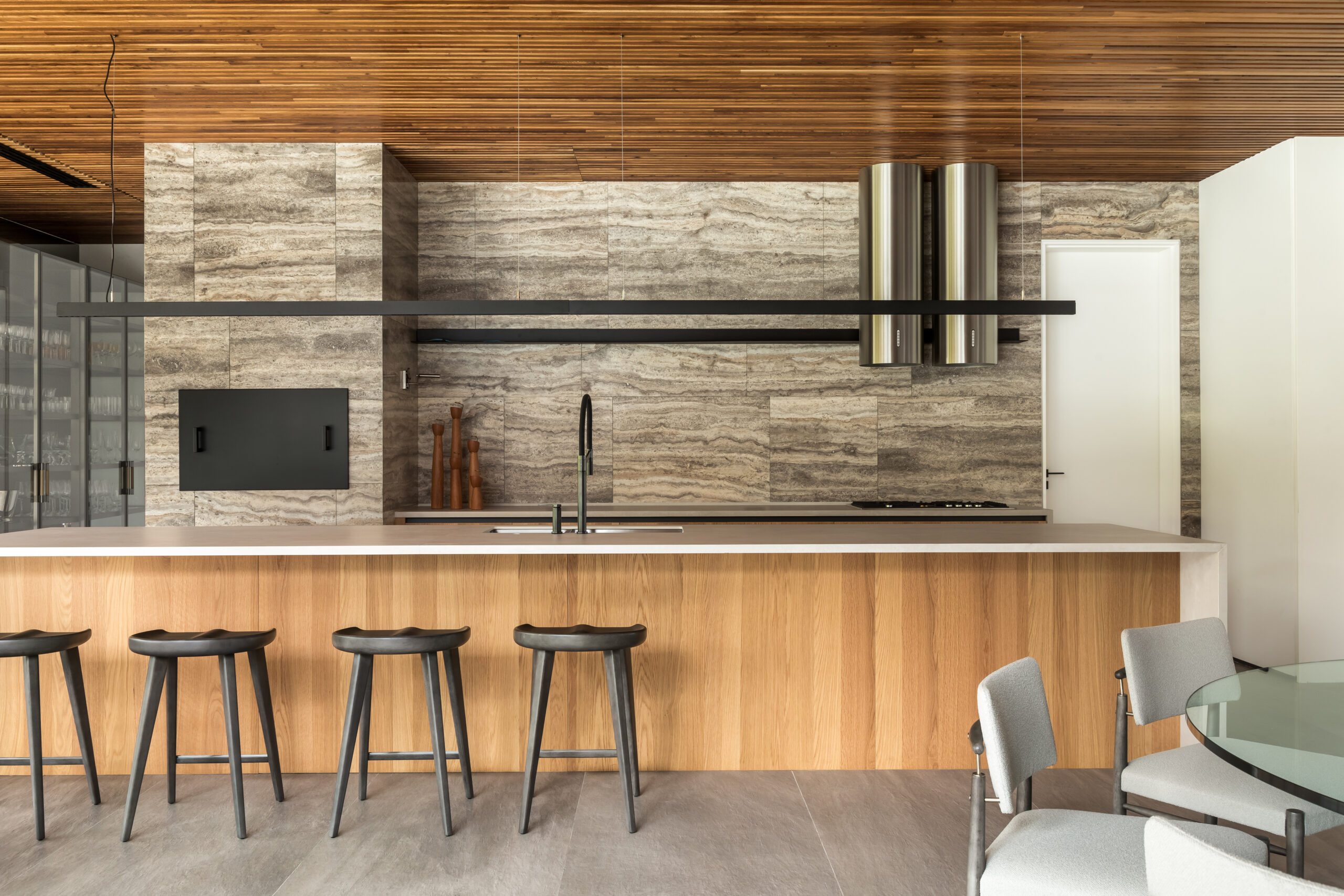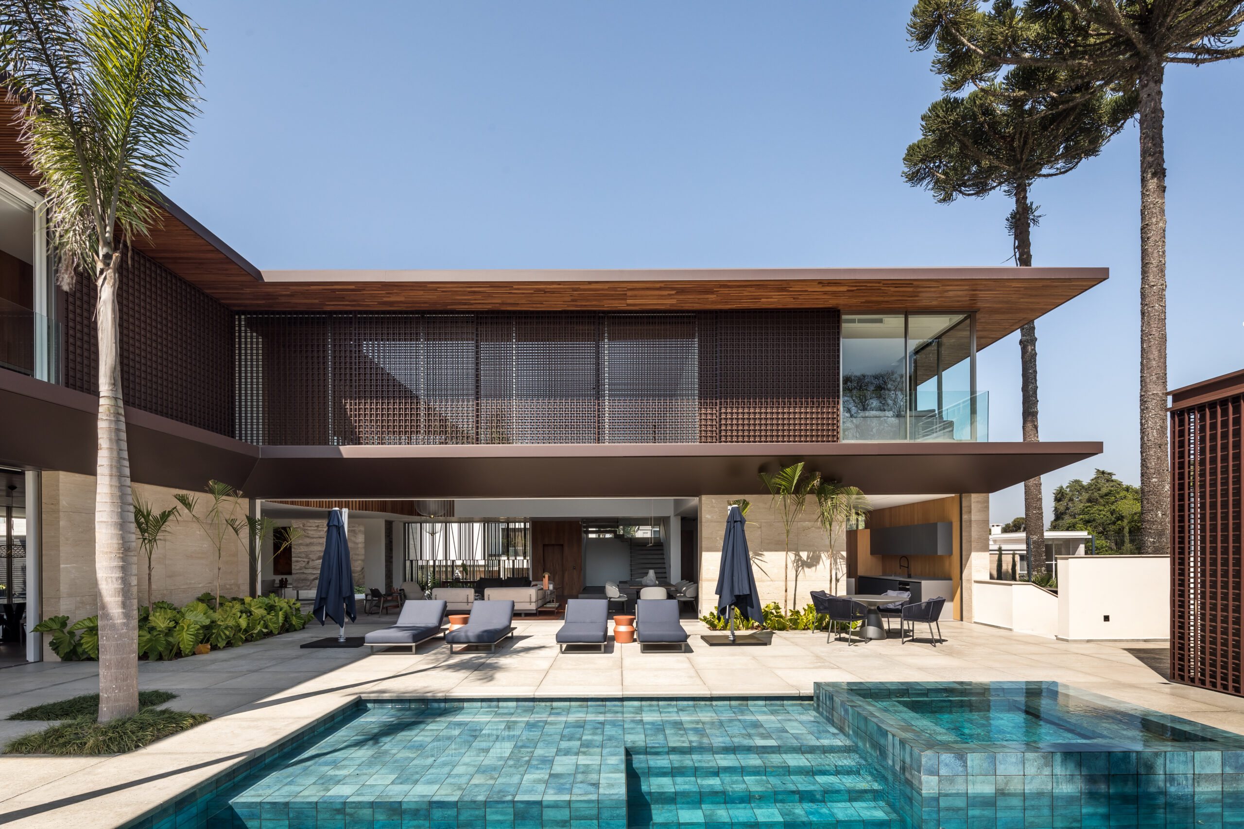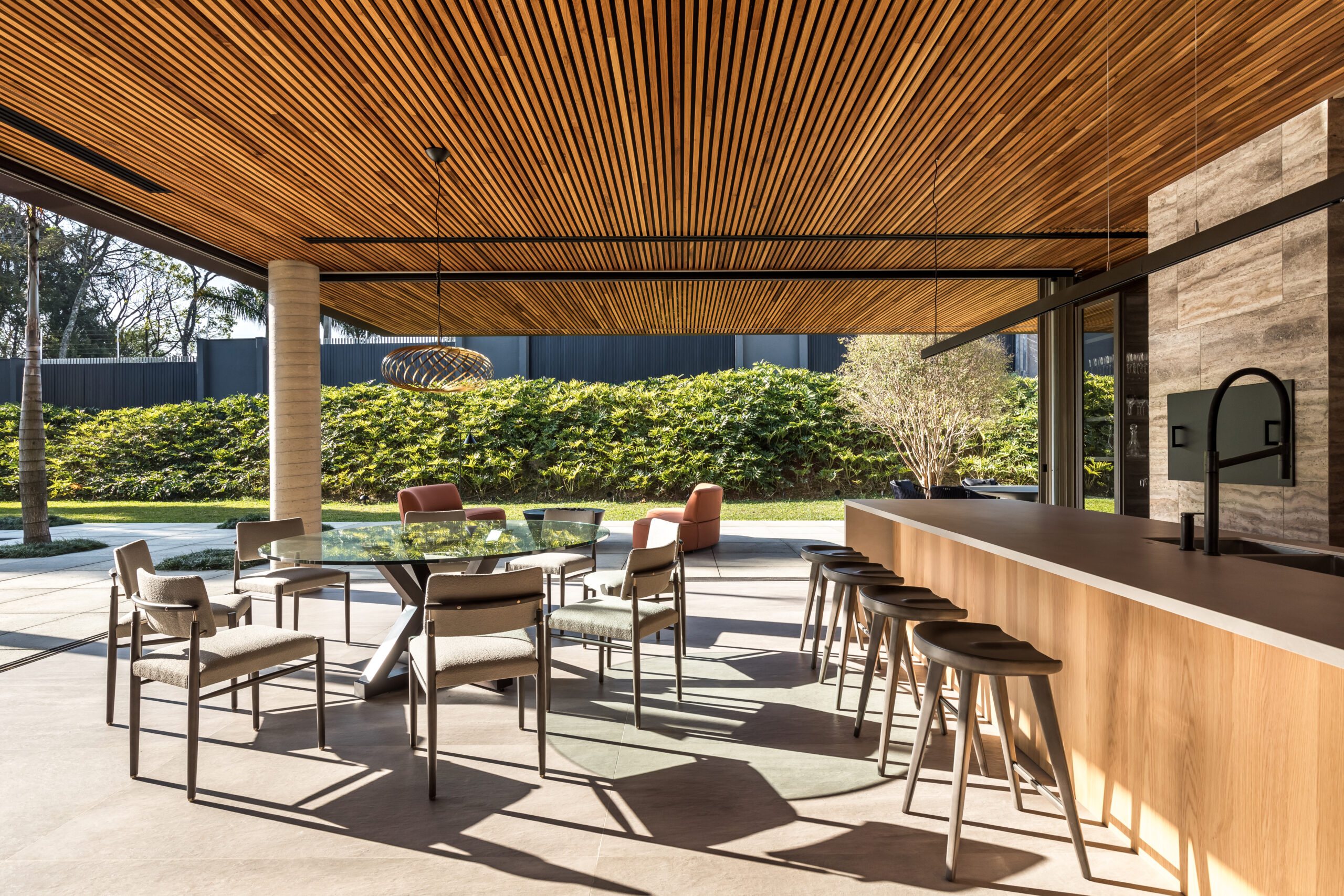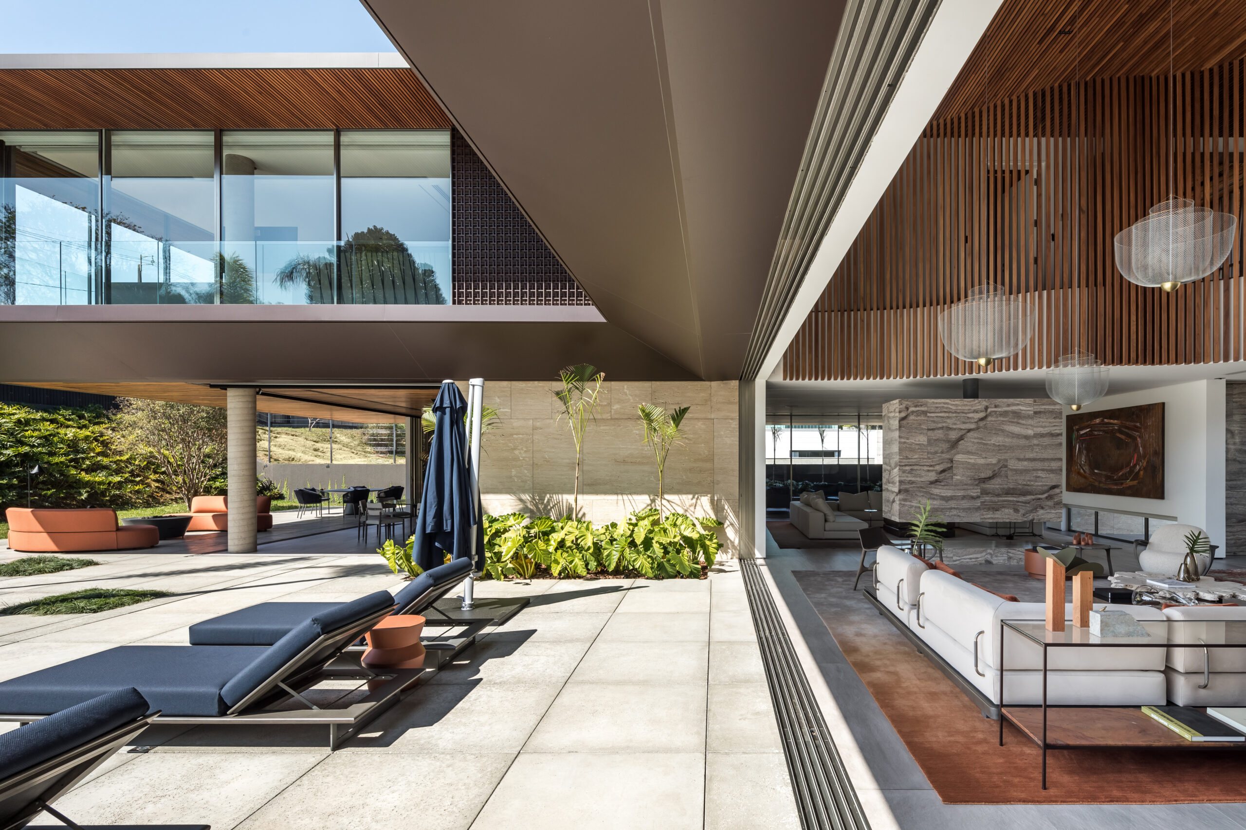 The design follows an L-shaped layout, creating a natural division between social and intimate spaces while framing a central green courtyard. Sliding glass doors, minimalist lines, and an open-plan ground floor dissolve the boundaries between interior and exterior. Every element - down to the materials - was chosen to strengthen this dialogue with the environment: warm freijó wood panels stretch from inside to outside, travertine marble wraps the façade and flooring, and large overhangs protect from direct sun while inviting natural light deep into the home.