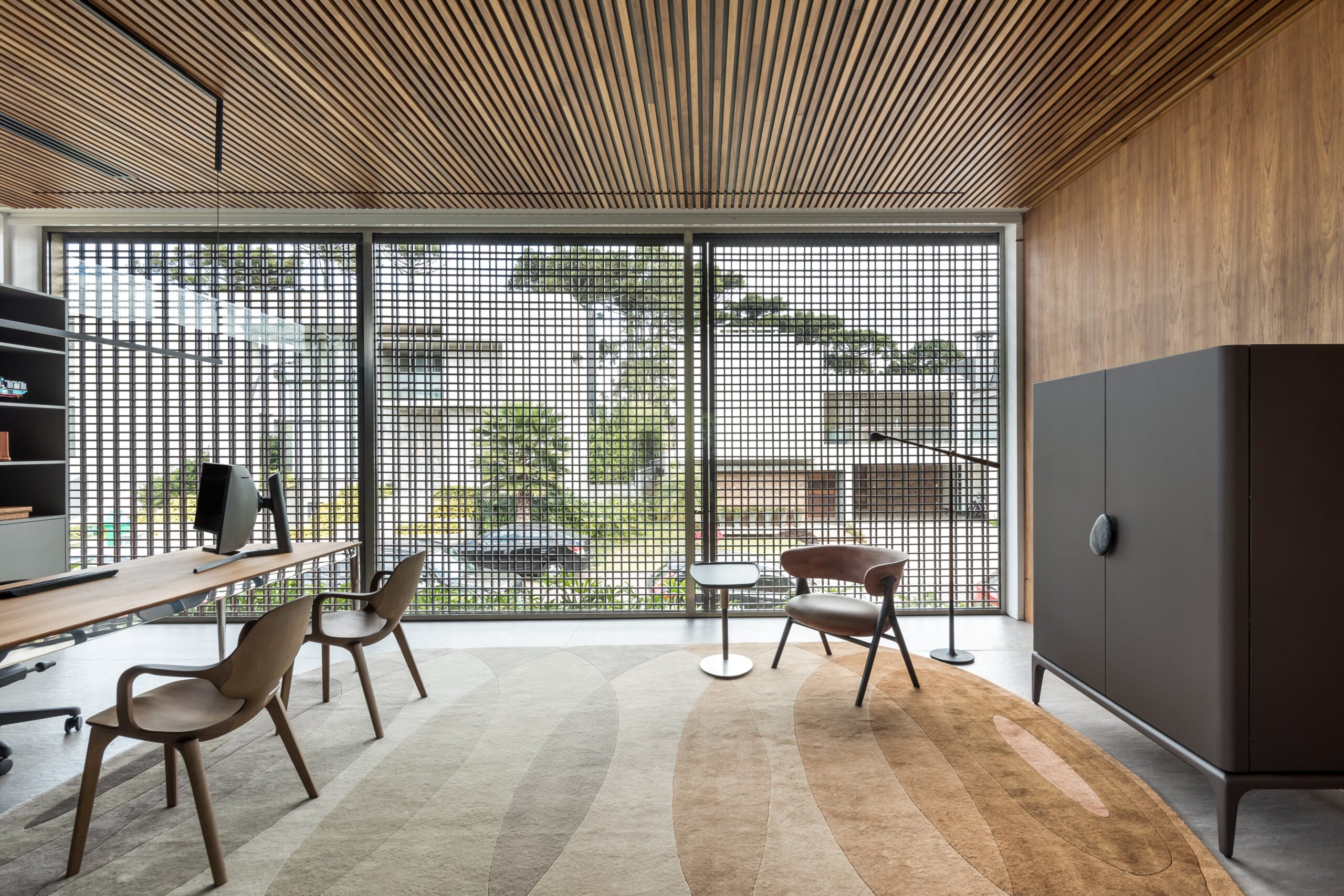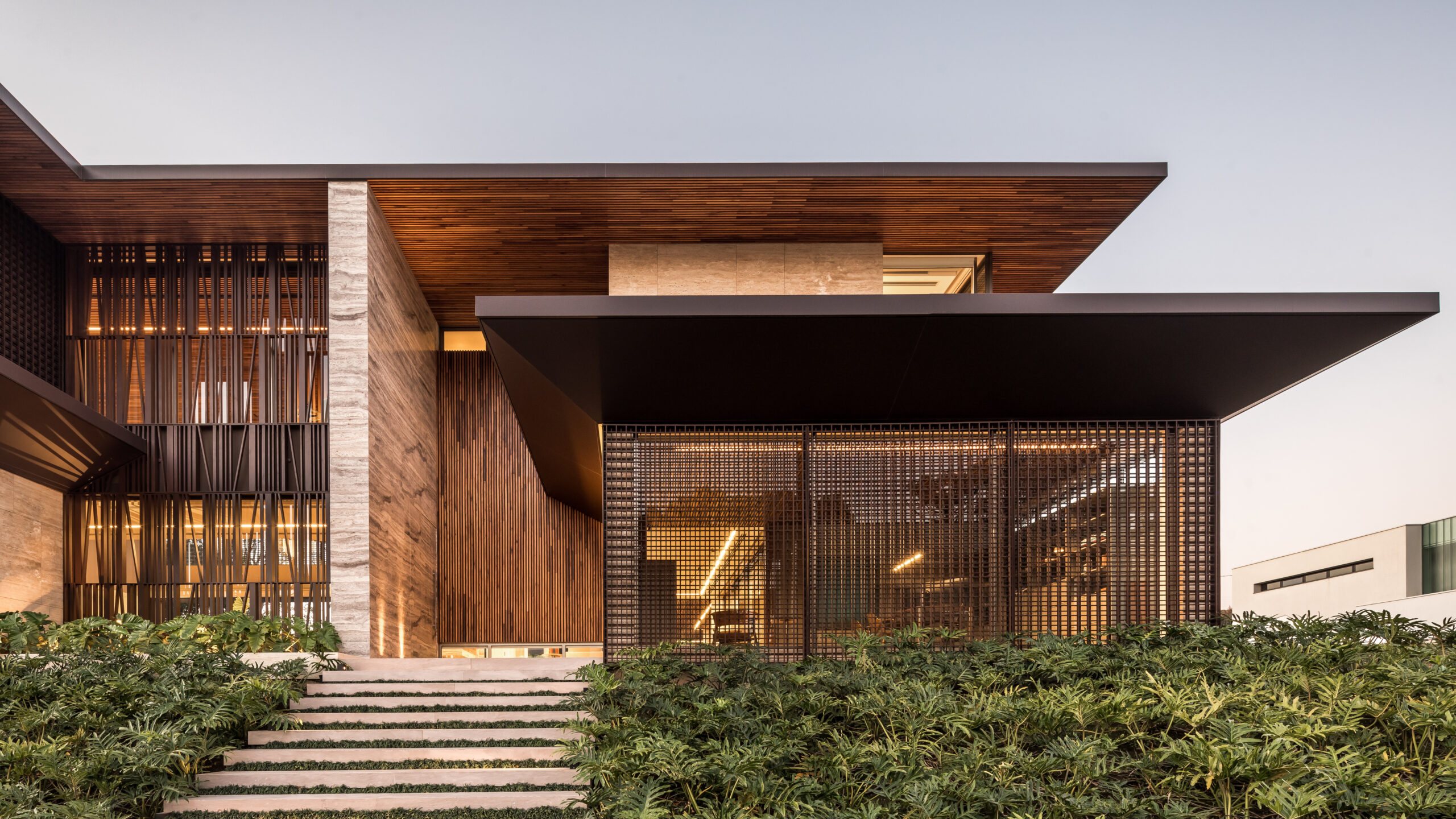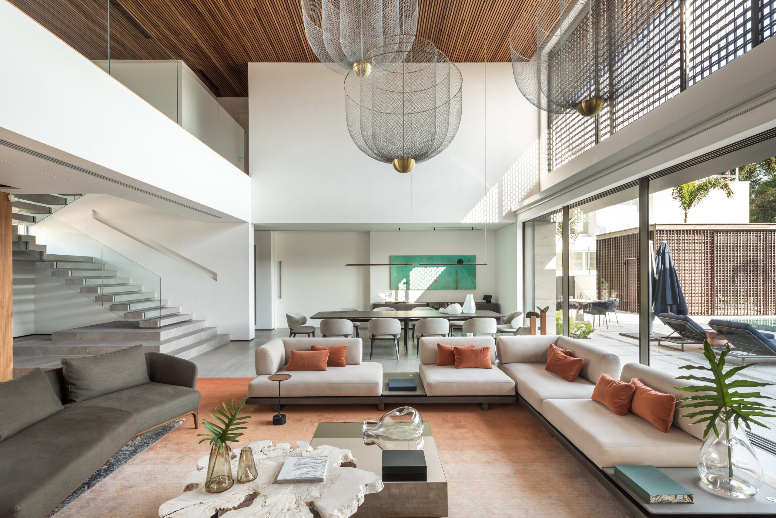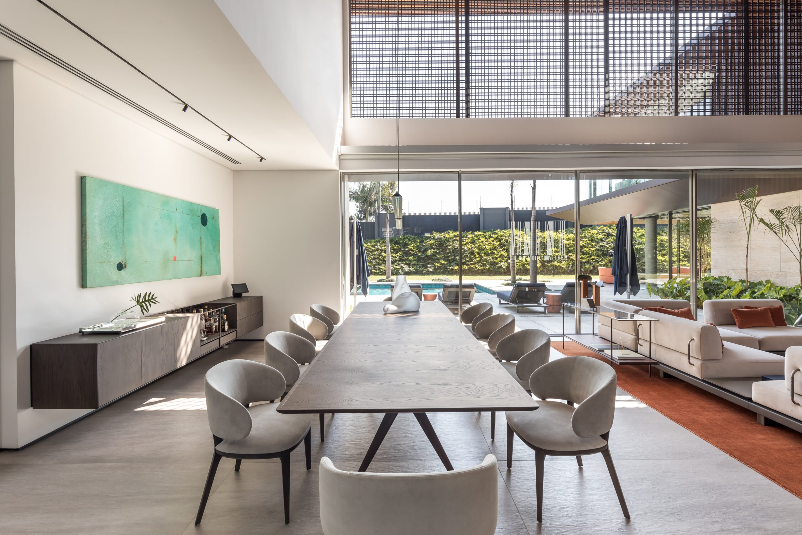 The design follows an L-shaped layout, creating a natural division between social and intimate spaces while framing a central green courtyard. Sliding glass doors, minimalist lines, and an open-plan ground floor dissolve the boundaries between interior and exterior. Every element - down to the materials - was chosen to strengthen this dialogue with the environment: warm freijó wood panels stretch from inside to outside, travertine marble wraps the façade and flooring, and large overhangs protect from direct sun while inviting natural light deep into the home.