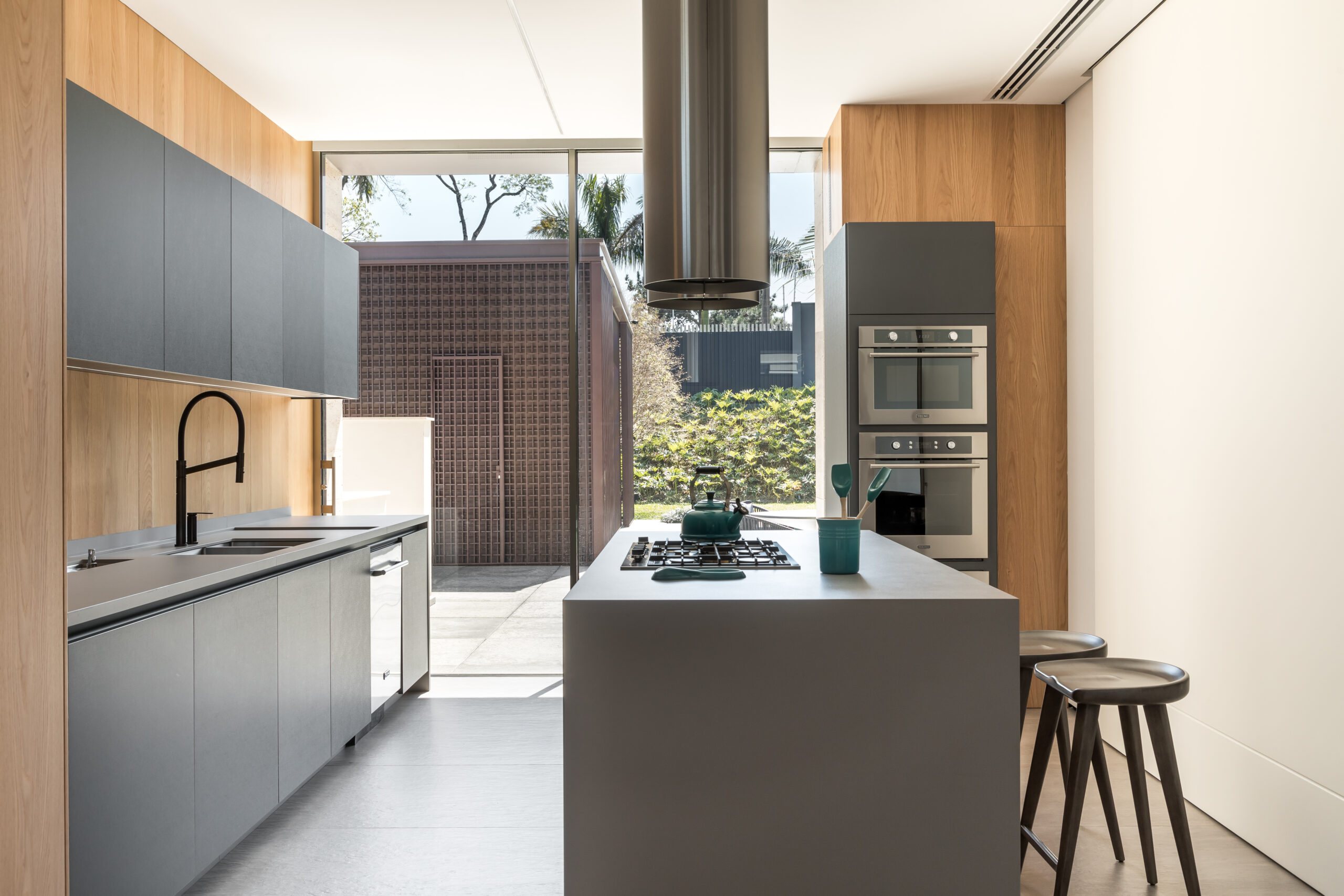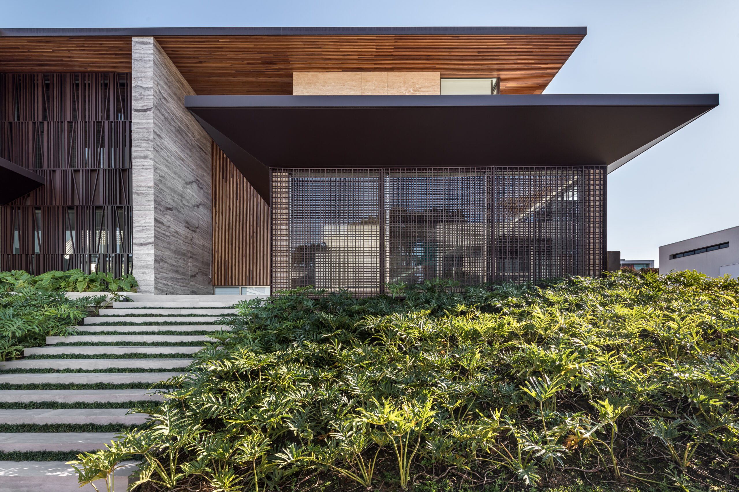 As the project unfolds vertically, the second floor seems to float over the garden, with intimate spaces distributed to take advantage of the site’s topography and views. A five-meter cantilever adds drama and lightness to the structure, demonstrating a sophisticated balance between bold design and site responsiveness.