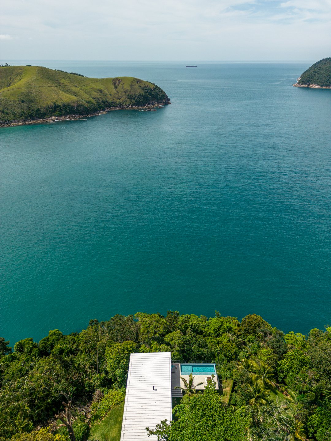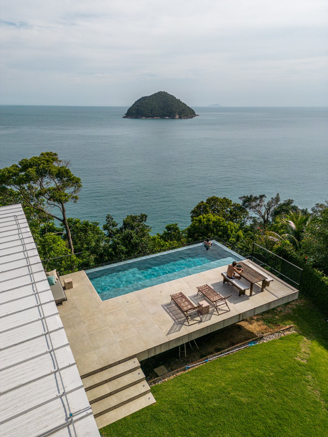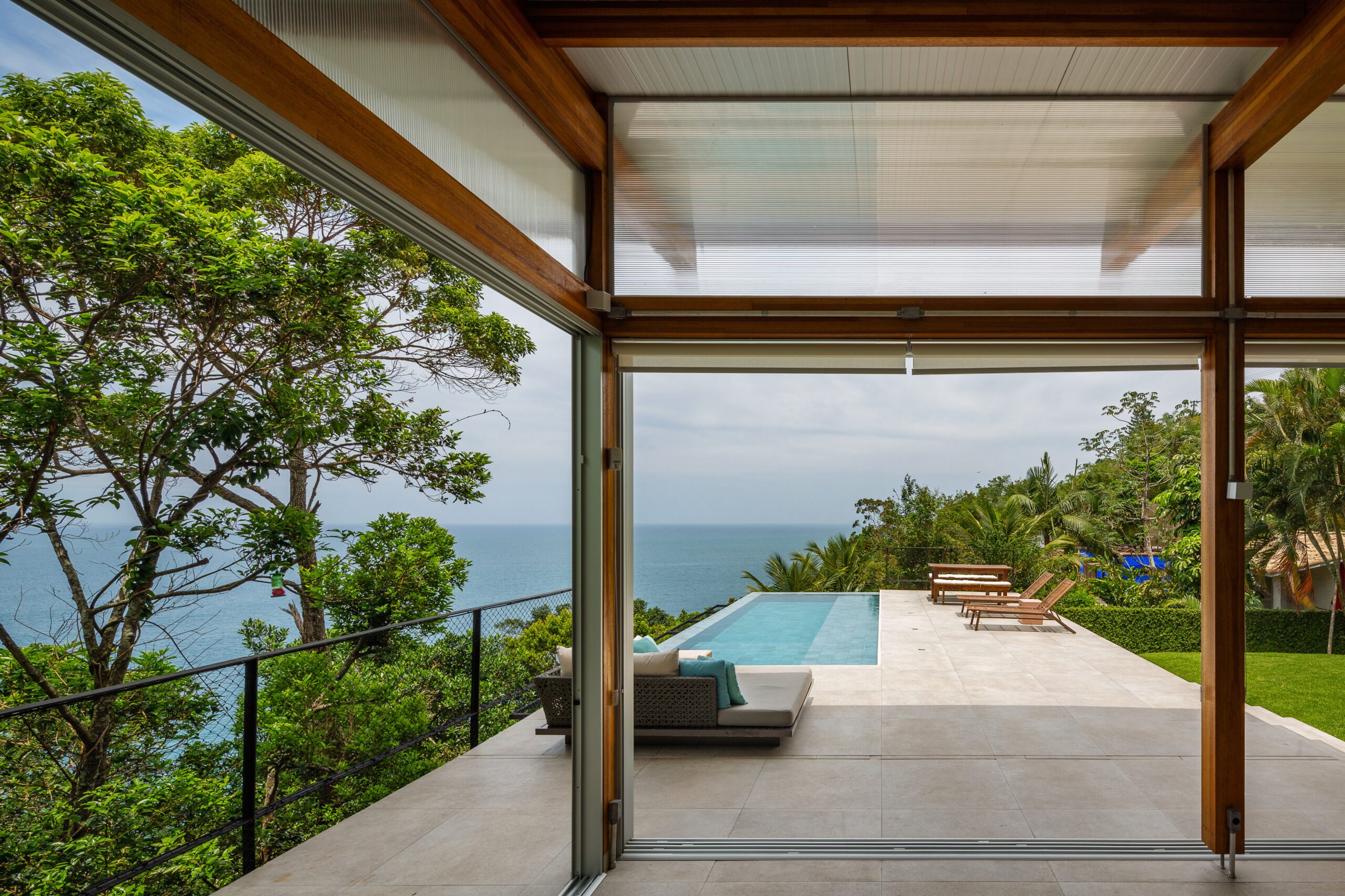 Instead of following the obvious logic of aligning the house parallel to the ocean, Nitsche rotated it perpendicular to the view. This gesture shaped a unique spatial sequence: three intimate forest-facing suites on one side and a living space on the other, fully open to the sea. A side-positioned pool stretches this living experience outward, framing uninterrupted views of horizon, rock cliffs, and sky.