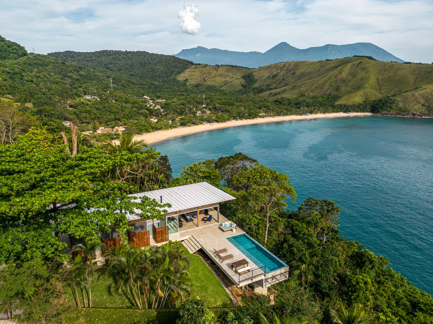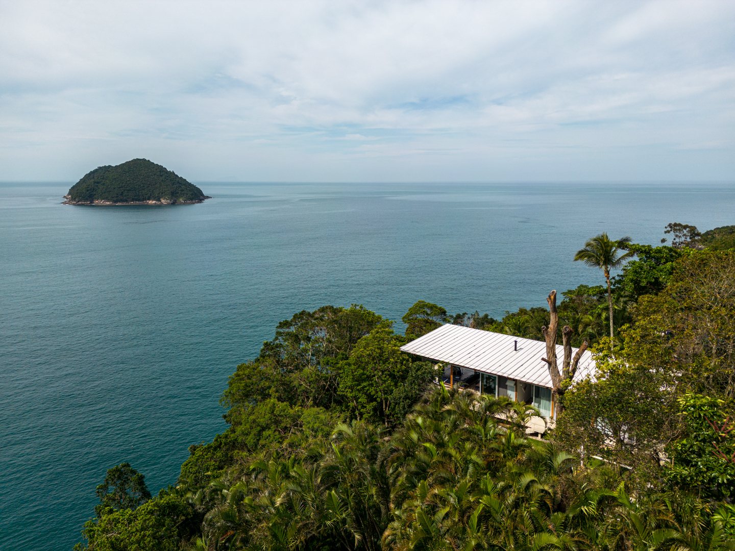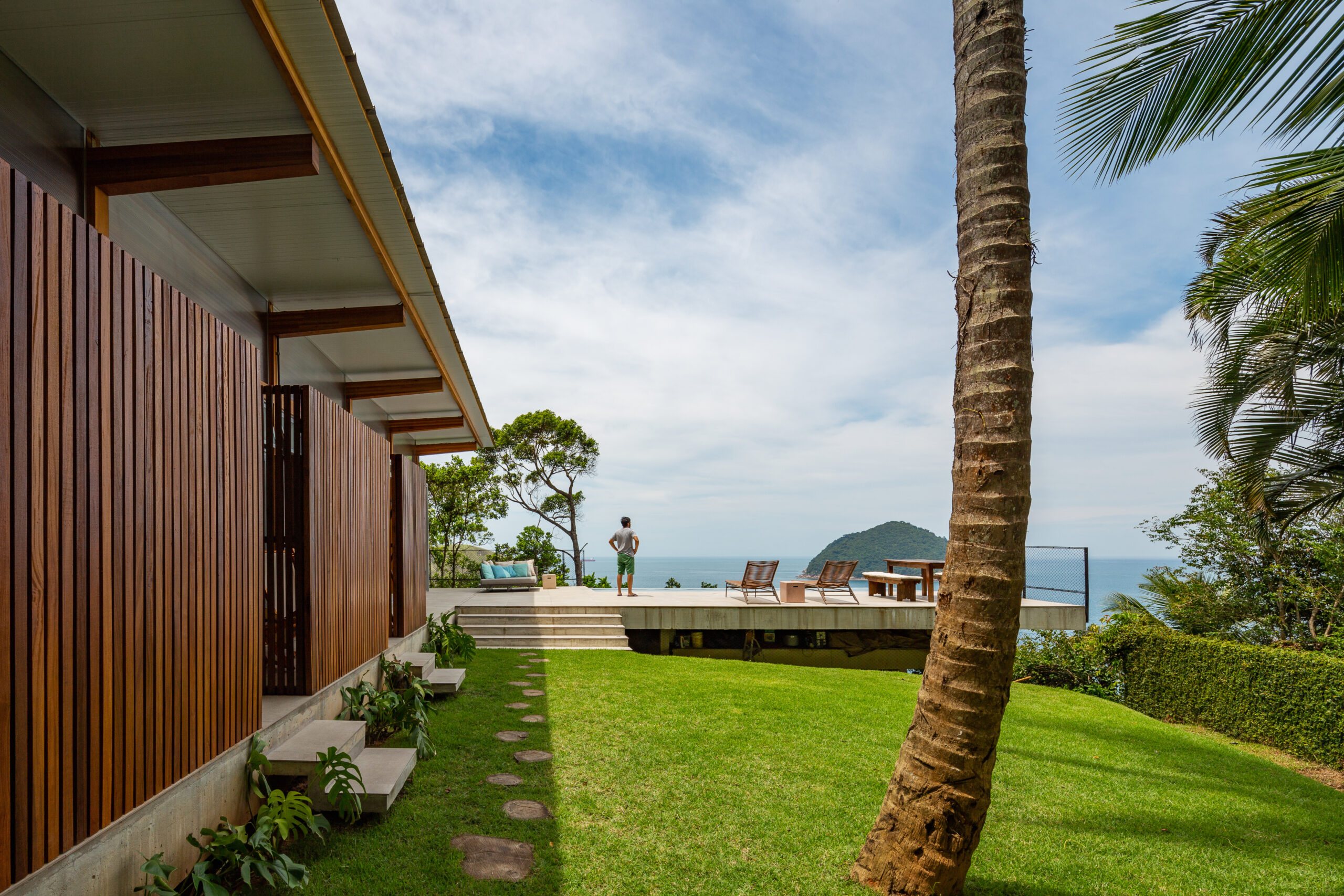 Instead of following the obvious logic of aligning the house parallel to the ocean, Nitsche rotated it perpendicular to the view. This gesture shaped a unique spatial sequence: three intimate forest-facing suites on one side and a living space on the other, fully open to the sea. A side-positioned pool stretches this living experience outward, framing uninterrupted views of horizon, rock cliffs, and sky.