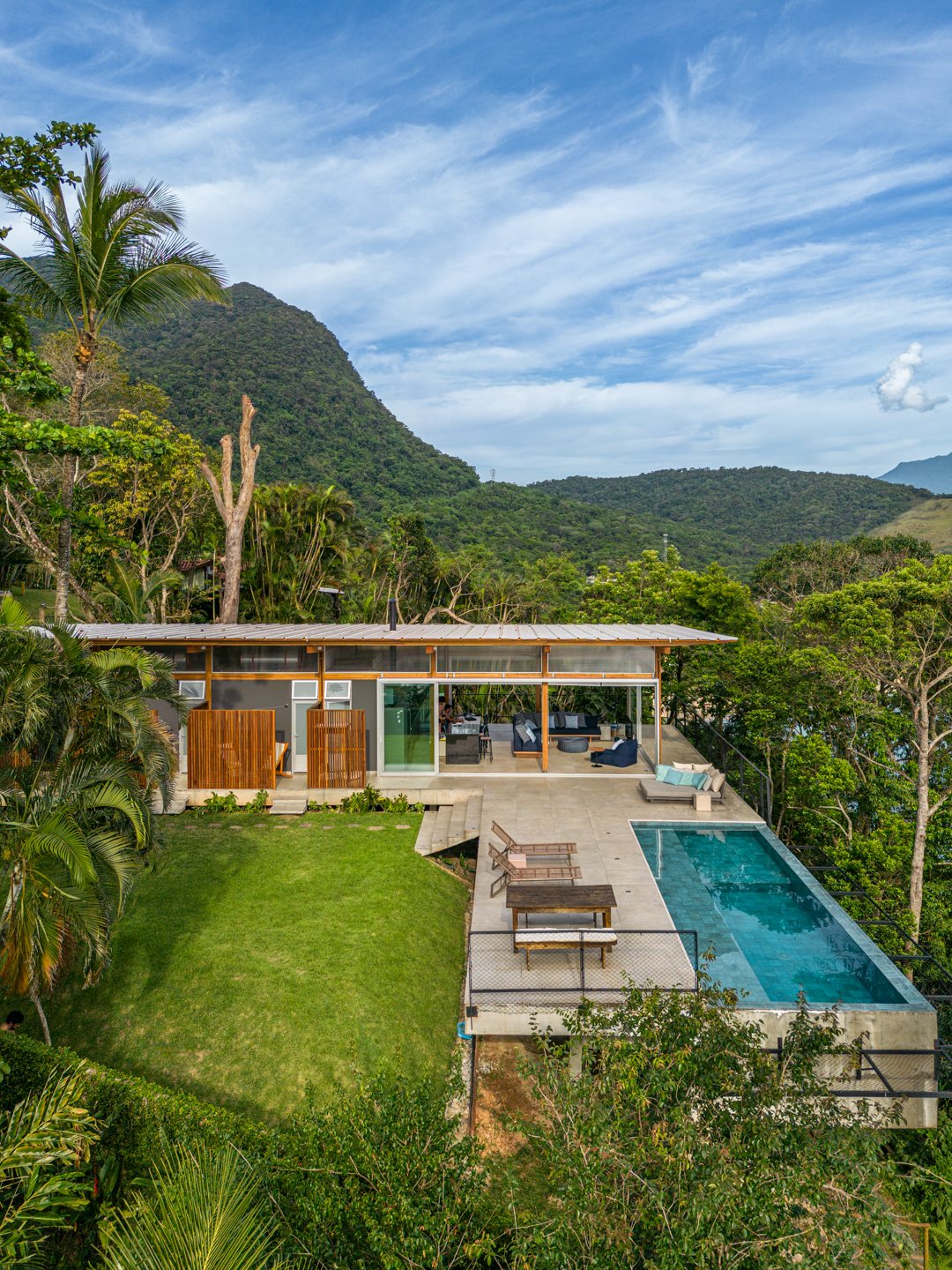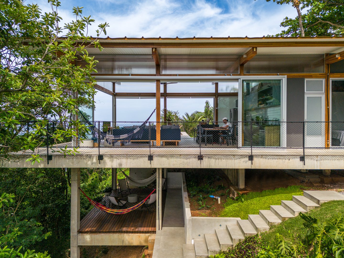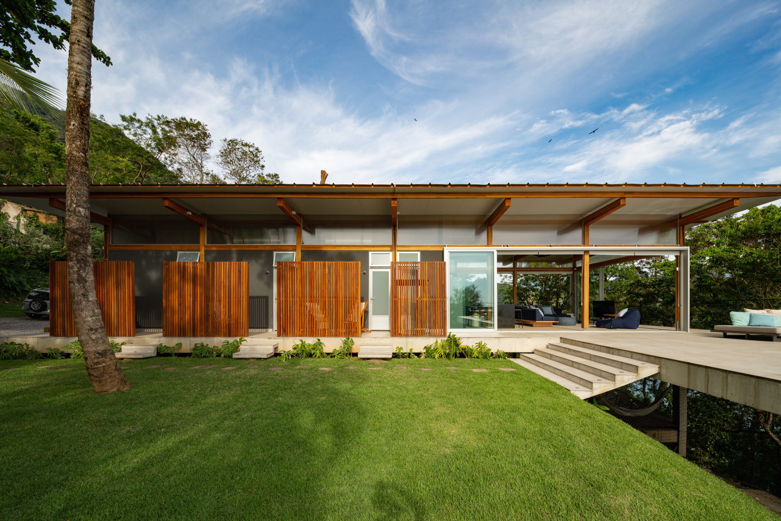 Materiality reinforces this soft footprint. A slender timber structure rests lightly on a minimal concrete platform, embracing the humid coastal climate. There are no redundant ceilings, no framed windows - only expansive sliding glass doors that dissolve the boundary between inside and outside. Life flows seamlessly with the forest’s sounds, breezes, and changing light.