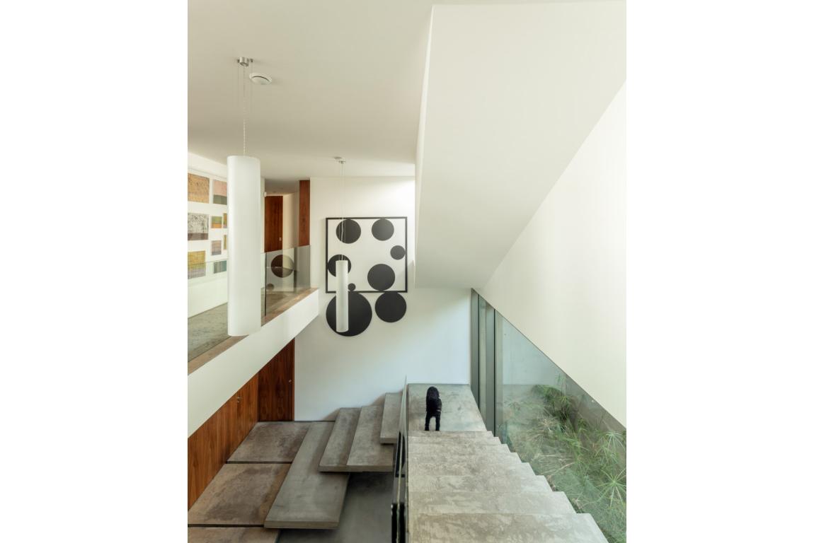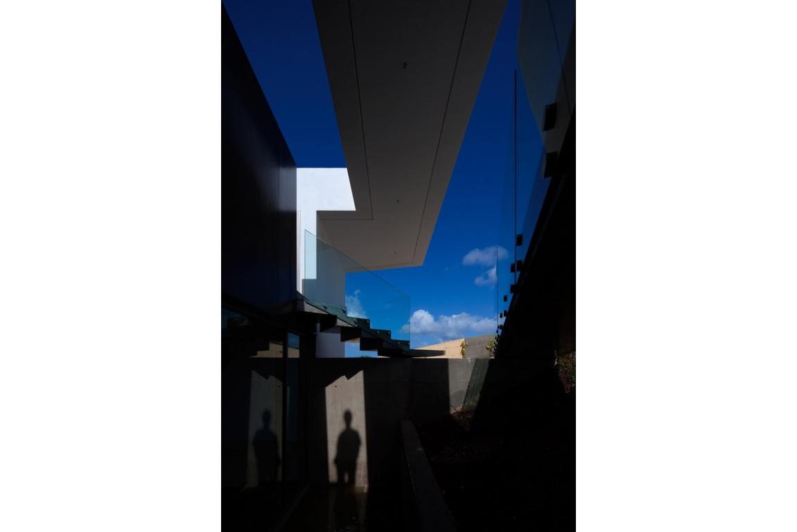 One of the primary determinants of the house's design was the environmental factors of the location. "The design of the house reflects the constraints and determinants that are present in the location," the owner explains. The rugged topography played a pivotal role in elevating the house off the ground. The surrounding slopes and buildings influenced its design, ensuring it resonated harmoniously with the neighbouring structures. Yet, it's not just the immediate vicinity that plays a role. From a distance, the shimmering horizon of the sea dictates the orientation of the house, lending it a fluid connection between its interiors and exteriors. The north-facing opacity addresses the prevailing winds, while shaded terraces counteract the strong sunlight. Infused with personal desires, dreams, and a love for architecture, the design of the house is adorned with "the perfume that complements the formal simplicity of the architectural object."