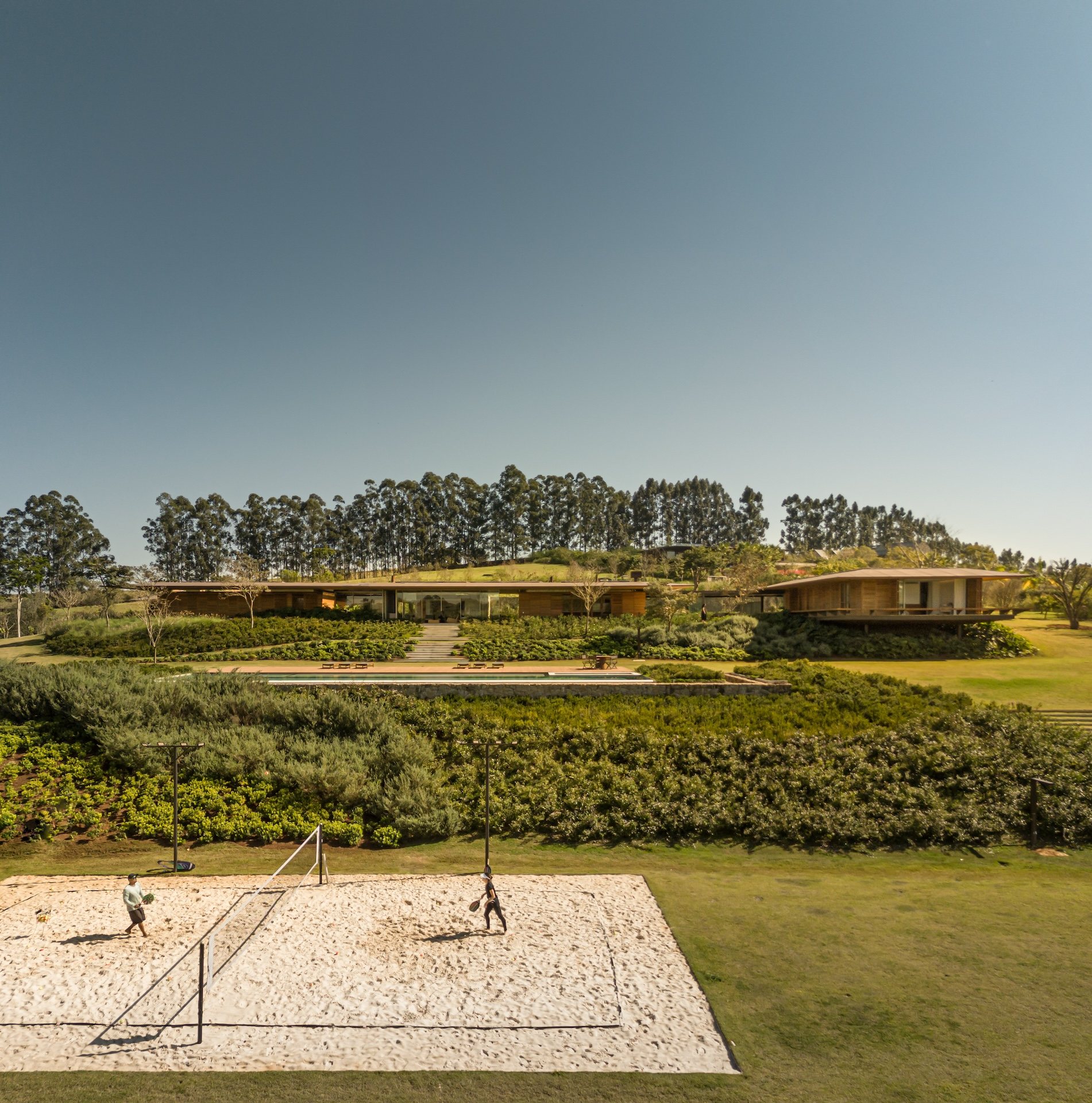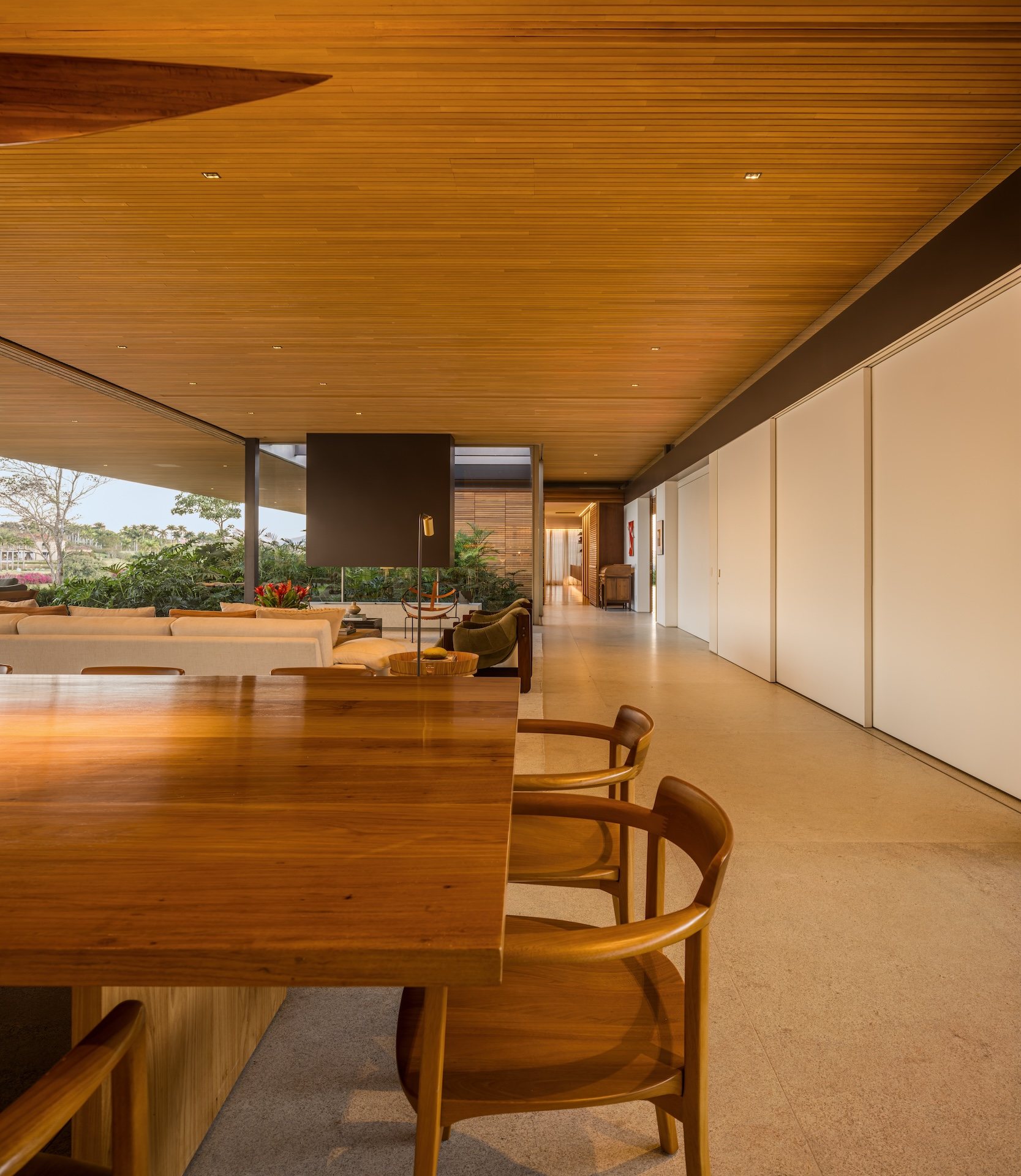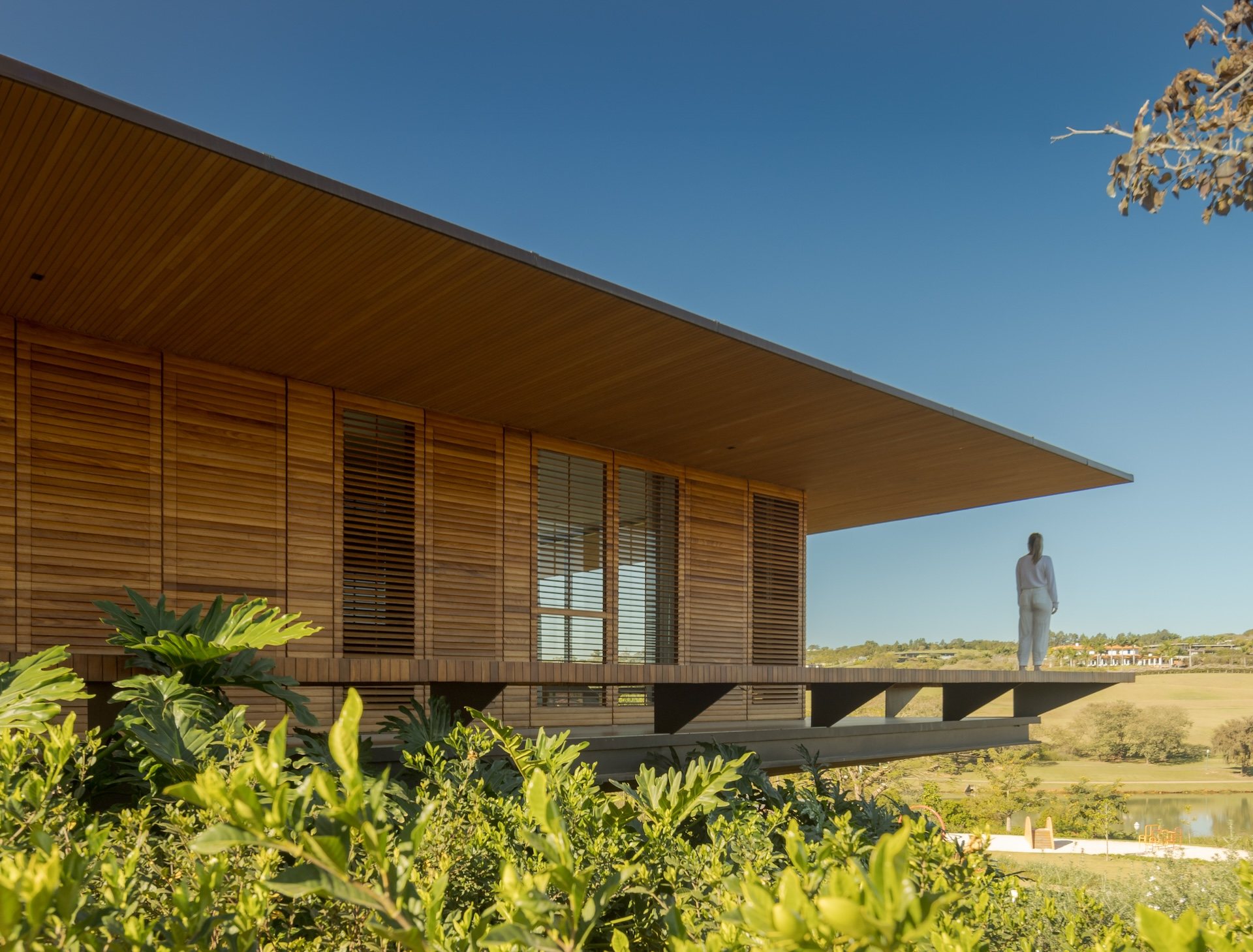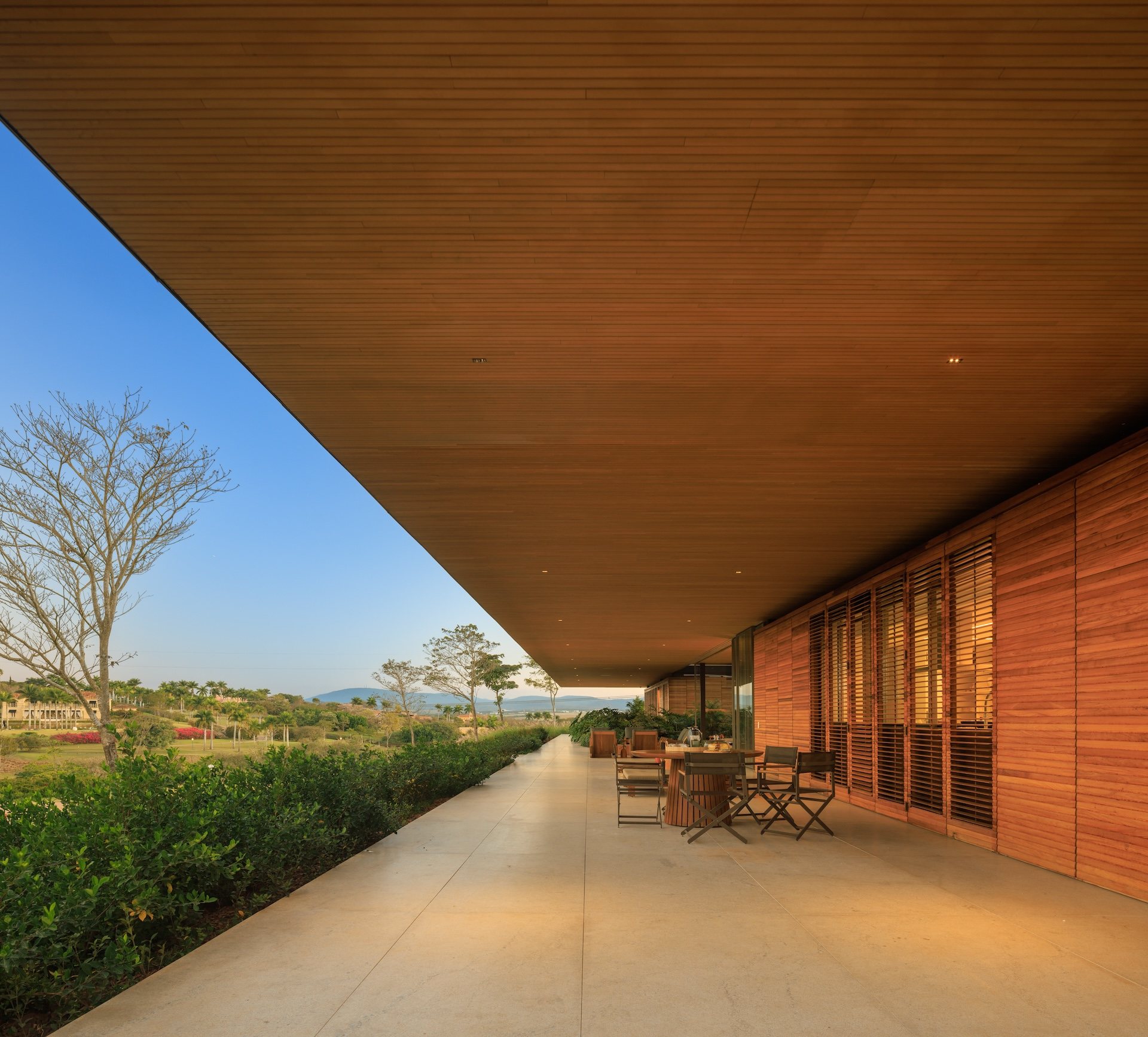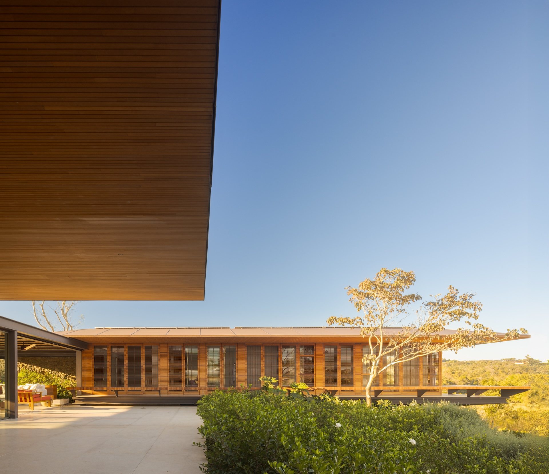 Material choices reinforce the project’s calm and grounded atmosphere. The metal structure allows for generous cantilevers that provide shade and mitigate heat, responding directly to the Brazilian climate. Sliding wooden screens filter sunlight and add texture while maintaining a sense of openness. Large glass panels connect every pavilion to the exterior, dissolving boundaries and encouraging a constant dialogue with nature.