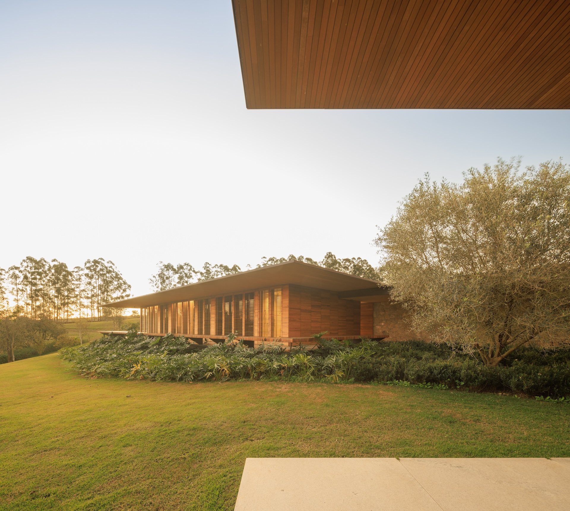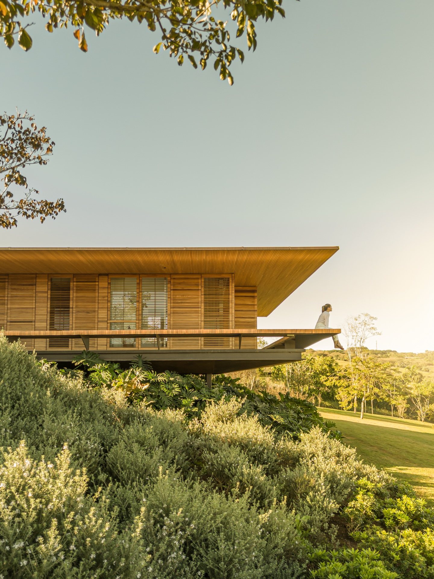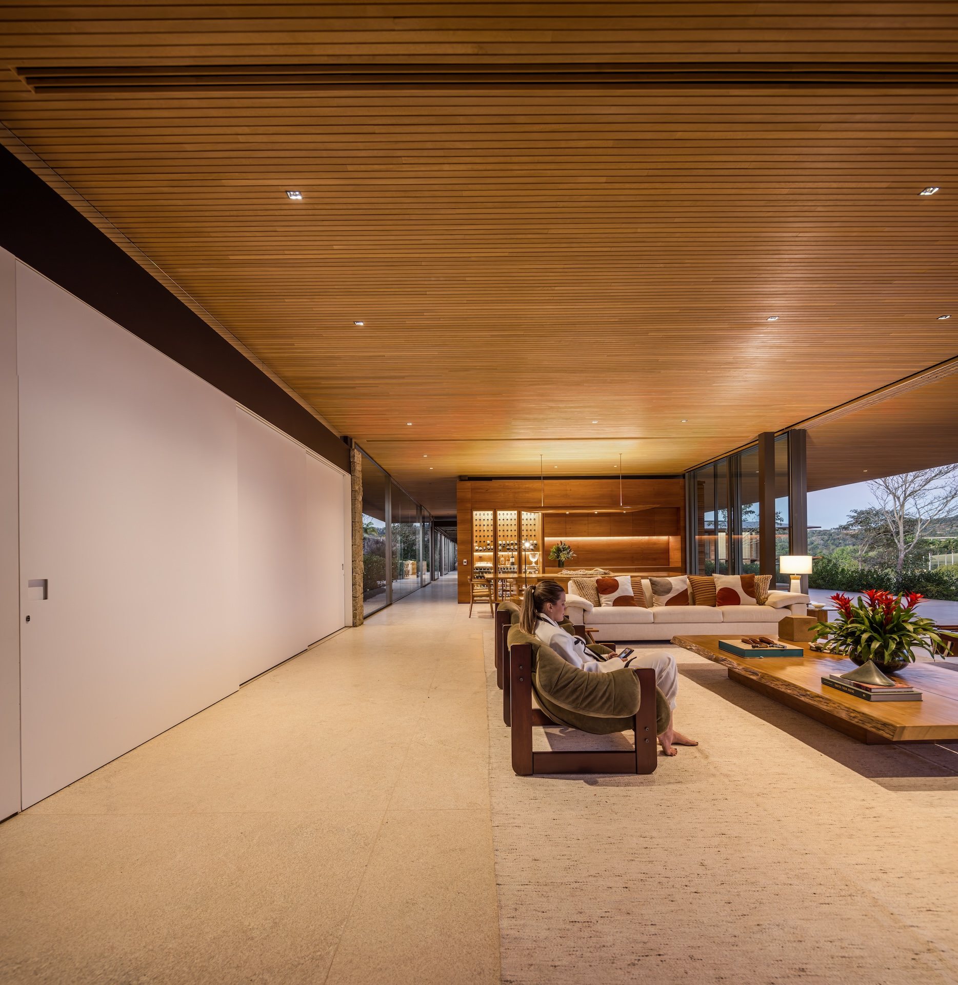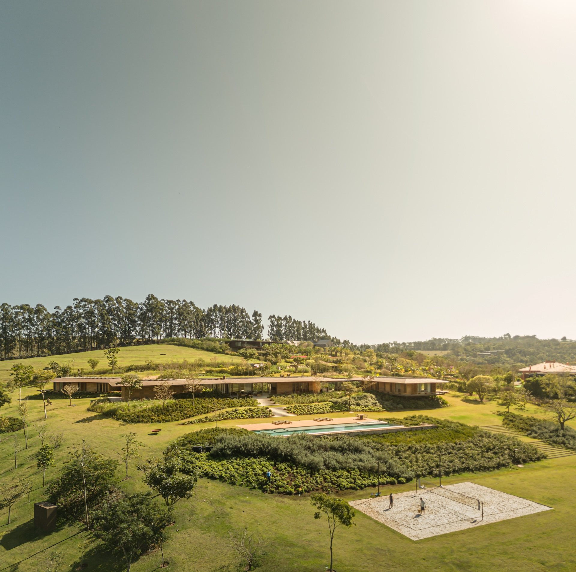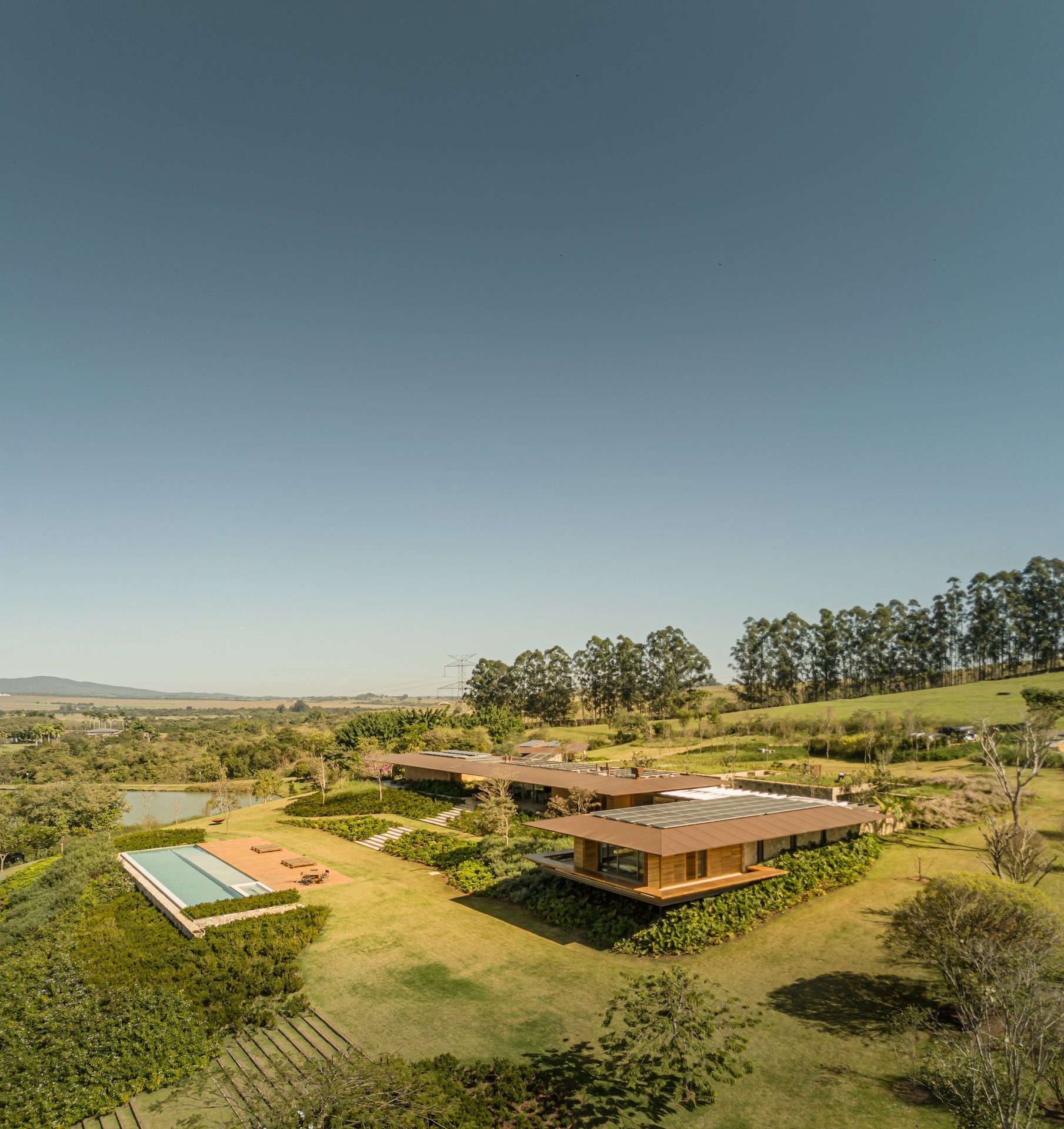 Material choices reinforce the project’s calm and grounded atmosphere. The metal structure allows for generous cantilevers that provide shade and mitigate heat, responding directly to the Brazilian climate. Sliding wooden screens filter sunlight and add texture while maintaining a sense of openness. Large glass panels connect every pavilion to the exterior, dissolving boundaries and encouraging a constant dialogue with nature.