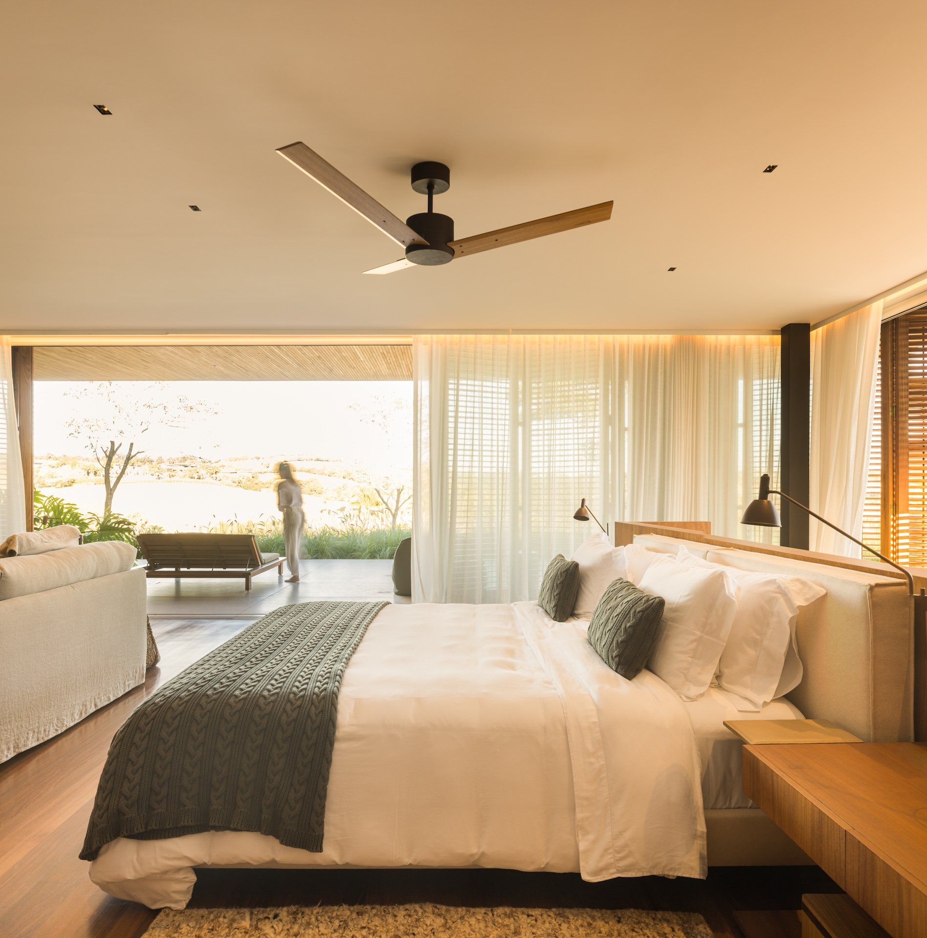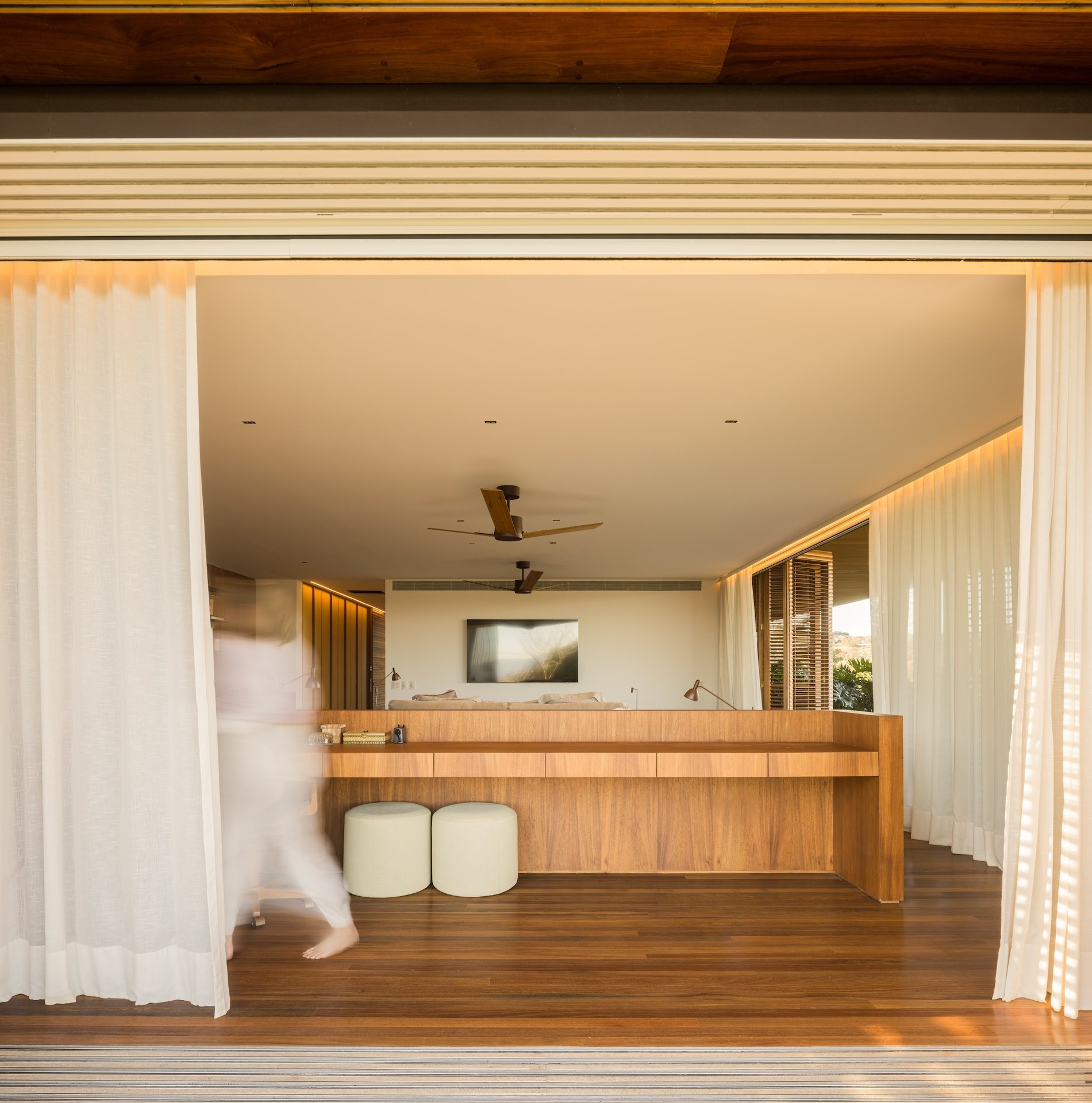 The program is distributed with intention and care. One pavilion contains the social areas and the mother’s suite, while each daughter has her own dedicated volume. A fourth pavilion houses the service and spa spaces. This layout supports both privacy and togetherness, turning circulation into a meaningful part of the experience. Walking between rooms becomes an opportunity to engage with the outdoors, passing under generous eaves, feeling the breeze, and staying visually connected to the surrounding garden.